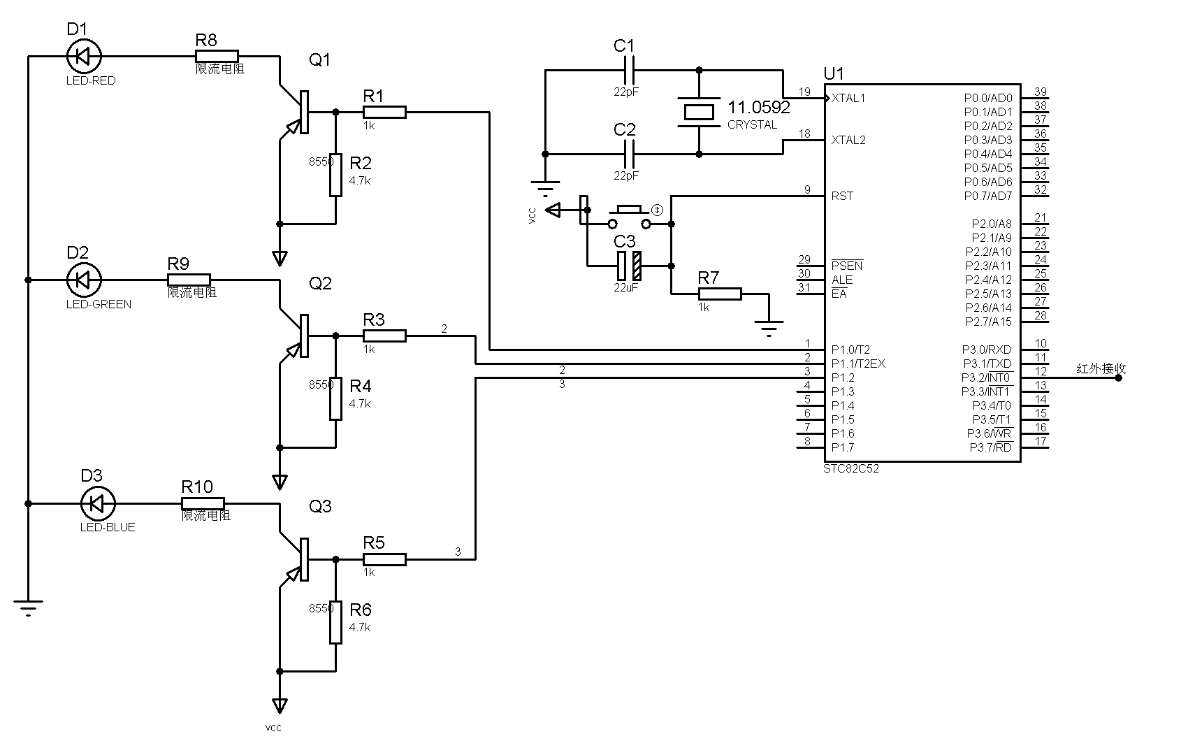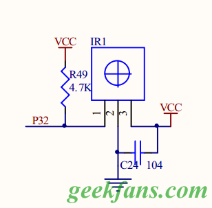 2紅外接收部分,我在protes中沒找到三個管腳的紅外接收器件,就干脆用了環宇電子提供的原理圖,就是大部分單片機開發配有的紅外實驗套件。