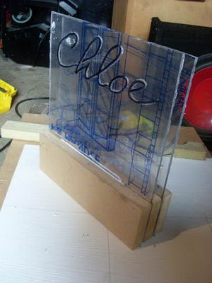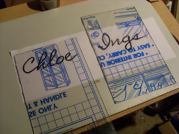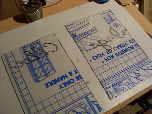 然后是用記號筆,在有機玻璃板上描畫出預先設定的圖案,然后要將玻璃板翻面,在玻璃板的背面(就是沒有貼膜的那一面)關于這一點也是找了參考文字的,所以也這樣做,我不知道原因,但就實際情況而言,在板子點亮的時候,背面雕刻的效果遠比在正面雕刻的效果要好。