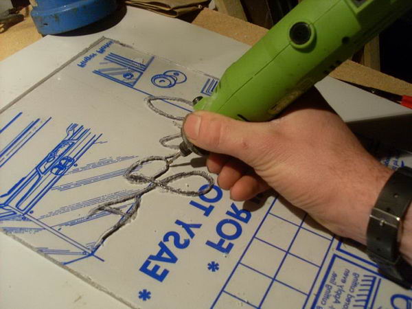 開始雕刻(在這里我就工具說一下,作者用是迷你打孔鉆,一般都配有專門的頭開打磨的,或者用斷過的鉆頭,直接用長的鉆頭,很容易折斷,有機玻璃板的硬度不算過硬,沒有鉆的朋友可以嘗試其他工具)..