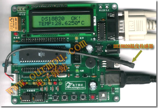 2、如前面的圖2所示:我們將燒寫好了通信程序的AT89S51芯片鎖緊到S51單片機實驗板上,然后把1602字符型液晶模塊插到實驗板的1602接口上,用RS232串口通信電纜和USB電纜將實驗板和電腦連接好,按壓實驗板的電源開關,開啟電源,此時實驗板上的電源指示燈亮起來,1602液晶模塊上會顯示出DS18B20傳感器狀態和實時溫度,同時將實時數據發送到RS-232串行通信接口,我們可以看到實驗板上的“通信”指示燈在閃爍,表示正在發送監控數據。