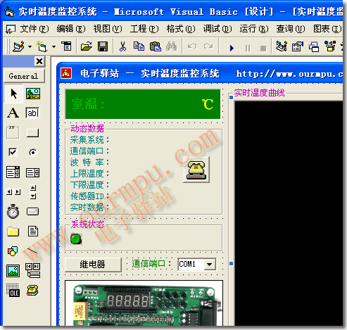 2、在計算機上,VB6.0編寫的實時溫度監控系統軟件通過RS-232串口接收S51增強型單片機實驗板發送過來的實時數據,經過運算處理后將DS18B20的傳感器ID、實時溫度顯示在軟件界面上;同時,繪制出溫度變化曲線,根據我們設定的上限報警溫度和下線報警溫度,判斷當前溫度有無高溫報警或低溫報警,如果溫度超限,則給出相應的報警信息。