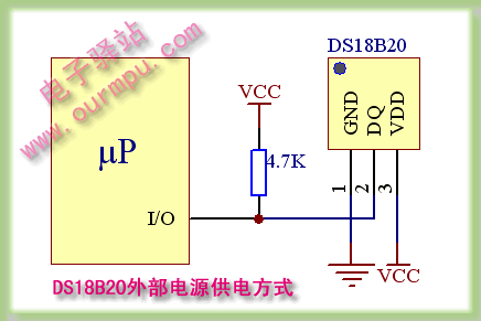 外部電源供電方式是DS18B20最佳的工作方式,工作穩定可靠,抗干擾能力強,而且電路也比較簡單,可以開發出穩定可靠的多點溫度監控系統。站長推薦大家在開發中使用外部電源供電方式,畢竟比寄生電源方式只多接一根VCC引線。在外接電源方式下,可以充分發揮DS18B20寬電源電壓范圍的優點,即使電源電壓VCC降到3V時,依然能夠保證溫度量精度。