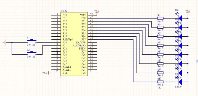 這個硬件電路是P3^0和P3^1控制按鍵1和2;P1口控制八個LED燈。
