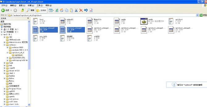 以arduino 0022為例,為了更接近官方的那么簡單的下載方法,我們先把解壓縮出來的兩個文件optiboot_atmega8.hex與optiboot_atmega8.lst放入