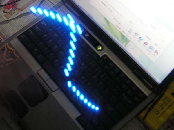 將這程序編譯下載到系統的單片機上,待LED燈光開始正常開跑后,我們拿著它在手上來回晃動,你發現這光已經不是一條豎直線了,它已經變成了一條條斜線。你可以適當修改程序中的延時,讓這一連串的斜線更漂亮些(寬和高基本一致),怎么樣,我們的最簡LED旋轉屏就這樣做成了。