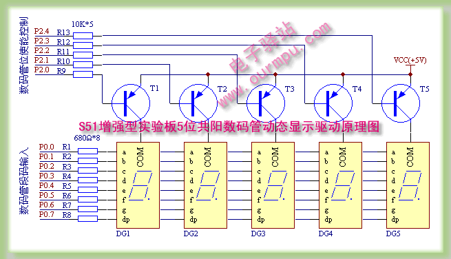 從原理圖可以看出,S51增強型實驗板中數碼管的段碼a,b,c,d,e,f,g,dp分別與單片機的P0.0~P0.7相連,控制數碼管中顯示的字形;數碼管的位選通由5個PNP三極管控制,分別接到單片機的P2.0、P2.1、P2.2、P2.3、P2.4端口上,程序中通過控制P2.0~P2.4端口的輸出電平就可以控制數碼管的顯示與關閉。如P2.0輸出低電平時,三極管T1導通,+5V電源加到第一個數碼管的COM端,那么第一個數碼管DG1就會顯示出相應的數字,顯示的數字由單片機P0.0~P0.7輸出段碼決定,當P2.0輸出高電平時,三極管T1截止,數碼管DG1就不顯示,從而實現數碼管位選通控制。同理,當P2.1輸出低電平時,則數碼管DG2顯示。。。