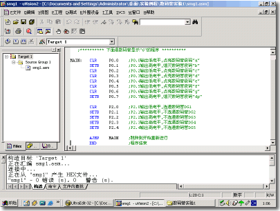 上面的源程序輸入完畢后,保存為"smg1.asm",然后添加到工程smg1.uv2中,最后源程序經過編譯得到目標文件"smg1.hex"(見下面的圖6所示),不熟悉Keil工程建立、設置及源程序編譯等詳細操作的初學者請參考網頁 >>> 手把手教你建立Keil工程。>>>