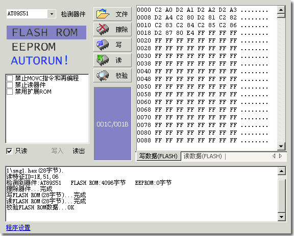 將產品配套光盤中的“ISP編程器驅動軟件”文件夾復制到你電腦硬盤的D盤根目錄下,并將其目錄下的所有文件的只讀屬性去掉,具體操作如下:全選文件夾中的文件,鼠標右鍵單擊出現文件屬性對話框,單擊“只讀”屬性前面復選框中的勾,使其只讀屬性去掉即可。然后雙擊文件夾中的“ISP編程器驅動軟件.exe”啟動編程軟件,點擊"文件",在打開文件的對話框中找到工程文件夾中的目標文件"smg1.hex"打開即可,然后點擊“AUTORUN”將程序燒寫到單片機內部(如下圖8)。