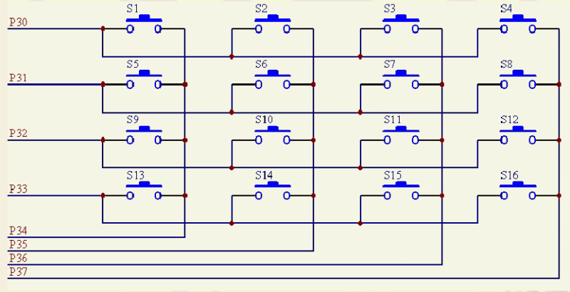 上圖中,1個按鍵占用一個IO口,如果有16個按鍵就占用了16個IO口。為了減少IO口的使用,就需要用矩陣的方式連線。如下圖
