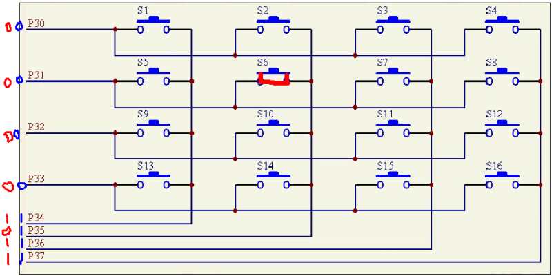 第一步,我們先確定列,給P3口賦值0xF0 = 1111 0000 ,那么P37、P36、P35、P34都被置1,P33、P32、P31、P30 都被置0,當S6被按下時,由于S6按鈕的一邊P31為0,所以跟S6另一邊相連的P35被拉低,即等于0。如下圖