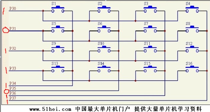 從圖可以看出P30、P31、P32、P33 為行(低四位),P34、P35、P36、P37為列(高四位)。