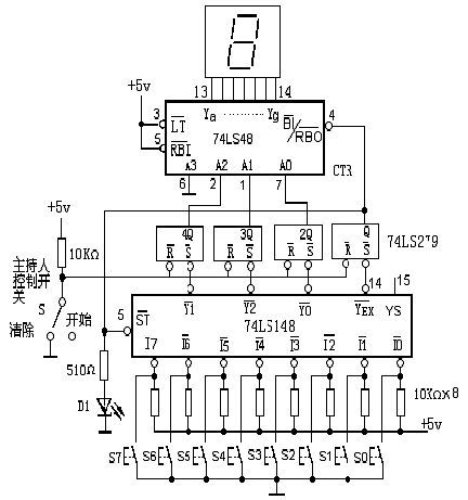 參考電路如圖所示。該電路完成兩個功能:一是分辨出選手按鍵的先后,并鎖存優先搶答者的編號,同時譯碼顯示電路顯示編號;二是禁止其他選手按鍵操作無效。工作過程:開關S置于"清除"端時,RS觸發器的 端均為0,4個觸發器輸出置0,使74LS148的 =0,使之處于工作狀態。當開關S置于"開始"時,搶答器處于等待工作狀態,當有選手將鍵按下時(如按下S5),74LS148的輸出 經RS鎖存后,1Q=1, =1,74LS48處于工作狀態,4Q3Q2Q=101,經譯碼顯示為"5"。此外,1Q=1,使74LS148 =1,處于禁止狀態,封鎖其他按鍵的輸入。當按鍵松開即按下時,74LS148的 此時由于仍為1Q=1,使 =1,所以74LS148仍處于禁止狀態,確保不會出二次按鍵時輸入信號,保證了搶答者的優先性。如有再次搶答需由主持人將S開關重新置?quot;清除"然后再進行下一輪搶答。74LS148為8線-3線優先編碼器,表11、1為其功能表。