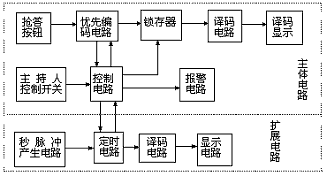 如圖所示為總體方框圖。其工作原理為:接通電源后,主持人將開關撥到"清除"狀態,搶答器處于禁止狀態,編號顯示器滅燈,定時器顯示設定時間;主持人將開關置?quot;開始"狀態,宣布"開始"搶答器工作。定時器倒計時,揚聲器給出聲響提示。選手在定時時間內搶答時,搶答器完成:優先判斷、編號鎖存、編號顯示、揚聲器提示。當一輪搶答之后,定時器停止、禁止二次搶答、定時器顯示剩余時間。如果再次搶答必須由主持人再次操作"清除"和"開始"狀態開關。