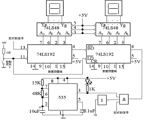 由節目主持人根據搶答題的難易程度,設定一次搶答的時間,通過預置時間電路對計數器進行預置,計數器的時鐘脈沖由秒脈沖電路提供。可預置時間的電路選用十進制同步加減計數器74LS192進行設計,具體電路如上圖所示。