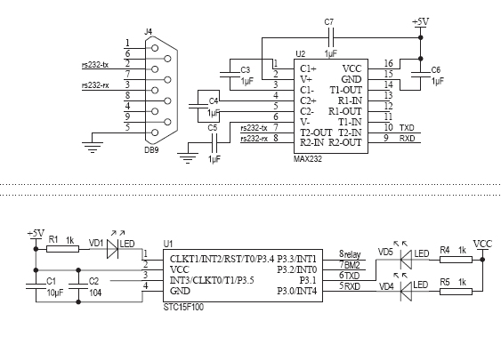 使用 STC單片機一鍵下載器,只需點擊“下載”即可完成程序的下載,無需再手動上電。下圖為STC單片機一鍵下載器原理圖(原理圖附后)所示。本下載器原理為:通過一片具有串口資源的單片機(電路中為STC15F102),將其串口與用戶單片機串口并接,監控單片機通過相應的監控程序來偵測用戶單片機與外部設備的串口信息交互,當監控到STC-ISP軟件正確下載命令流時,說明用戶正在進行程序下載,此時下載器自動啟動硬重啟實現對用戶單片機的上電,完成程序的下載。