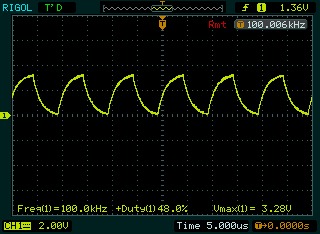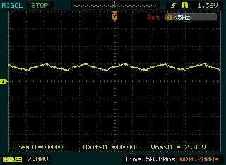當測試電阻為10K時,波形已經變成這個鳥樣子了,可以看到,圖中的最大電壓也從3.6V降到了3.28V