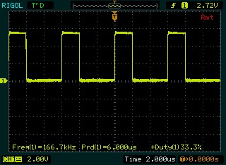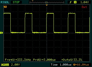 這個時候,頻率變成了333.3kHZ了,說明這已經是最快的速度了,但問題是,占空比還是33.3%,不解中。理論上來說,應該是50%的占空比才對,也許是芯片內部,下降保持的速度大于上升時保持的速度吧。