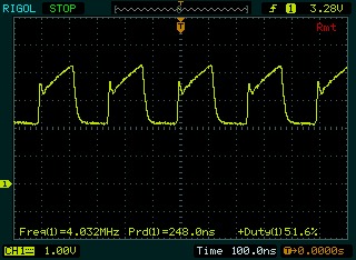從上面的波形猜測,頻率接近18Mhz,是不是因為管腳速度太快,由于管腳的分布電容電阻引起的波形變化。