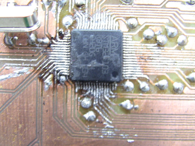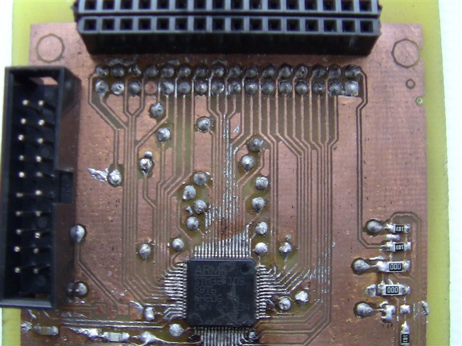 芯片是stm32f103RB 64角,比44角的stc難焊很多,主要是引腳太密了不過好在都焊上了,焊了快1小時,以為都得烤壞了呢,沒想到一插,還能亮真是萬幸