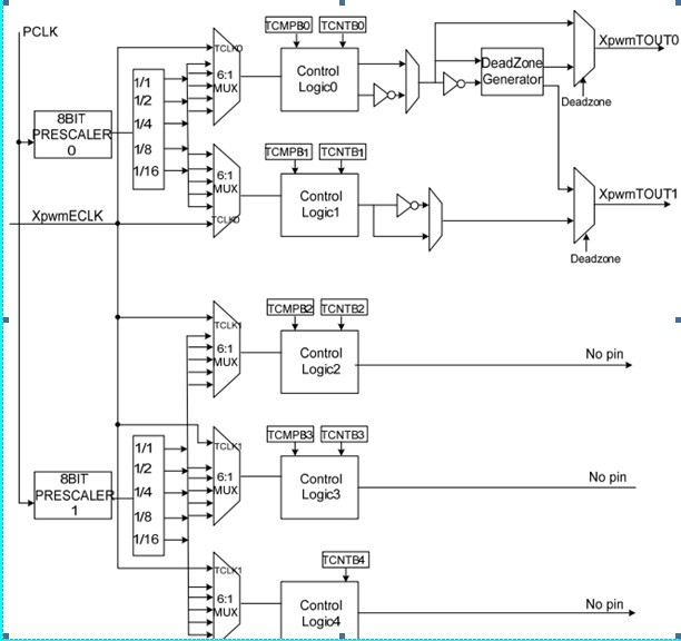 PCLK ---à 經過8位的預分頻器【8bit prescaler0】 --à 分頻器divider [1/1 1/2 1/4 1/81/16] -à 多路選擇器 MUX -à 邏輯控制器【比較TCMPBn和TCNTBn的數值】--à(deadzone generator ) --à 時鐘