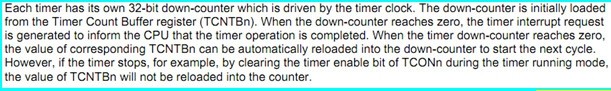 從上面內容看出。TCNTn和TCMPn是內部的寄存器(internal registers ).而TCNTn寄存器的值可以通過讀取寄存器TCNTOn來獲得。