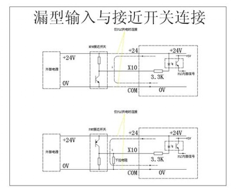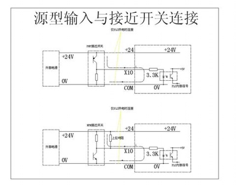 相反,當采用NPN集電極開路型接近開關時,由于接近開關內部輸出端與24V間的電阻很大,無法提供電耦合器件所需要的驅動電流,因此需要增加“上拉電阻”。如圖。增加下拉電阻后應注意,此時的PLC內部輸入信號與接近開關發信狀態相反,即接近開關發信時,“上拉電阻”上端為0V,光電耦合器件無電流,內部信號為“0”;未發信時,PLC內部DC24V與0V之間,通過光電耦合器件、限流電阻、“上拉電阻”經公共端COM構成電流回路,輸入為“1”。