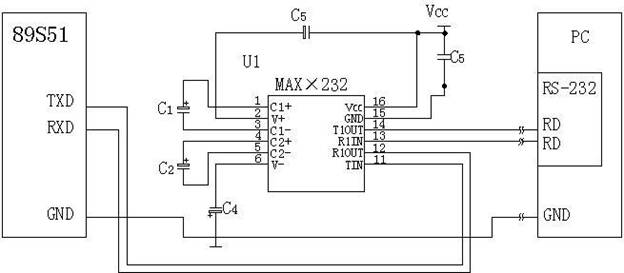 對于某些沒有輸出RS-232 信號的芯片,設計者常用MAX 232 (芯片通信輸出的TTL 電平轉換到RS-232 信號的器件) 來把PC 和該芯片相聯.在圖六中,89S51 首先通過TxD 發送數據到MAX 232 T1IN,然后MAX 232 在它的內部把TTL 電平信號轉換為RS-232 信號,最后MAX 232 通過T1OUT 發送到PC 的COM 接口,此時PC 就接收到了我們發送來的數據(反過來就是接收數據:COM TxD ->R1IN ->R1OUT ).關于單片機方面的知識可以上m.raoushi.com查閱.寫得比較容易理解.
