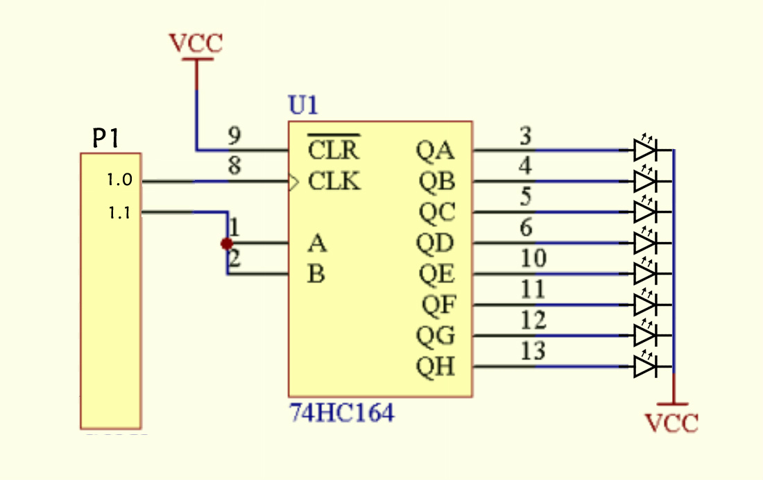 有了寄存器,只需要2個IO口就可以擴展連接8個LED,整個電路中,我一共用了3個74HC164,終于解放了緊張的IO口。