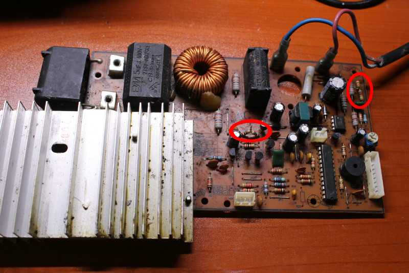 沒錯啊。這就是電磁爐上電路板,看著一點技術含量也沒有……也正是如此后面才會有著“坑爹”的維修過程。當然了,這時候它已經是被修好的了,這是后面補拍的。注意,紅圈中兩個電阻都是更換的,而且,兩個都是串聯起來用的---備品備件不足,只用先湊合著用了。