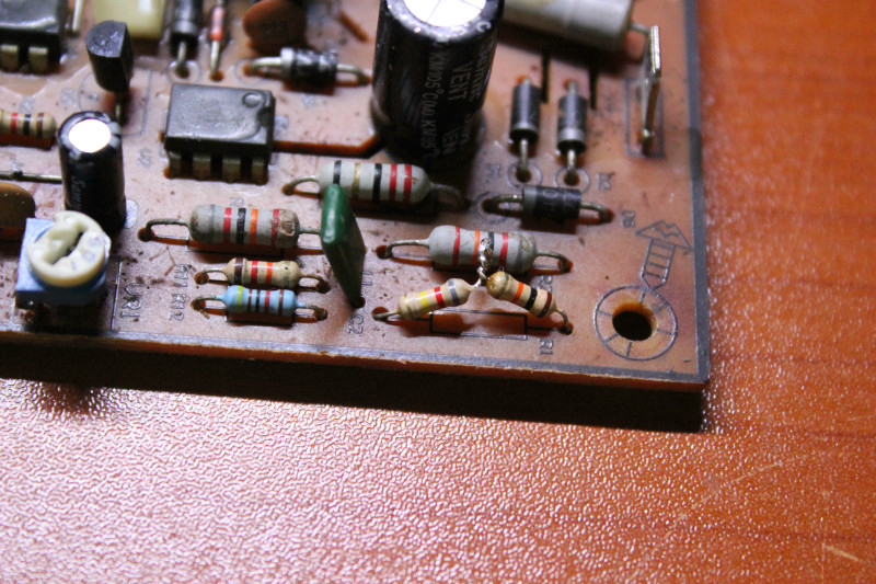 首先從三極管開始,全部通過;接下來是電解電容,全部通過;坑爹啊,到了電阻,這一堆……真的得全部都玩一遍???兩只超大電阻過后,情況終于出現轉機,一顆色環為“紅橙黑紅銀”的電阻兩邊阻值無窮大----嘿嘿,還不把你抓出來。