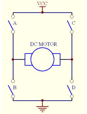從圖中可以看出,假設開關A、D接通,電機正向轉動,而開關B、C接通時,直流電機將反向轉動,從而實現了電機的正反控制。當然實際應用中我們還可以得到其它兩種狀態: