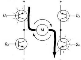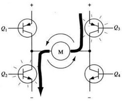 要使電機運轉,必須使對角線上的一對三極管導通。例如,如圖圖8所示,當Q1管和Q4管導通時,電流就從電源正極經Q1從左至右穿過電機,然后再經Q4回到電源負極。按圖中電流箭頭所示,該流向的電流將驅動電機順時針轉動。當三極管Q1和Q4導通時,電流將從左至右流過電機,從而驅動電機按特定的方向轉動。