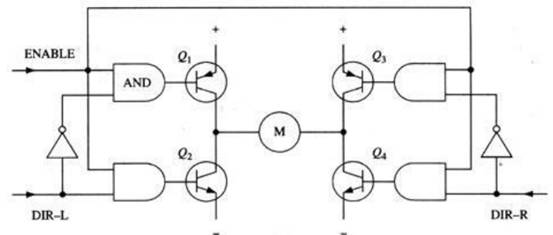 驅動電機時,保證H橋上兩個同側的三極管不會同時導通非常重要,如果三極管Q1和Q2同時導通,那么電流就會從正極穿過兩個三極管直接回到負極,此時電路中除了三極管外沒有其它任何負載,因此電路上的電流就可能達到最大值(該電流僅受電源性能限制),甚至燒壞三極管。基于上述原因,在實際驅動電路中通常要用硬件電路方便地控制三極管的開關。