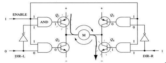 采用以上方法,電機的運轉只需要三個信號控制,如圖11:兩個方向信號和一個使能信號。如果DIR-L信號為0,DIR-R信號為1,并且使能信號是1,那么三極管Q1和Q4導通,電流從左至右流經電機,如圖6 所示;如果DIR-L信號變為1,而DIR-R信號變為0。那么Q2和Q3將導通,電流則反向流過電機。