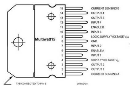 L298N內部的組成其就是上面講的H橋驅動電路,所以工作原理我以上介紹的H橋相同,這里我們不在敘述,在使用時重點要了解其引腳的功能和主要的性能參數。引腳圖如圖12所示。