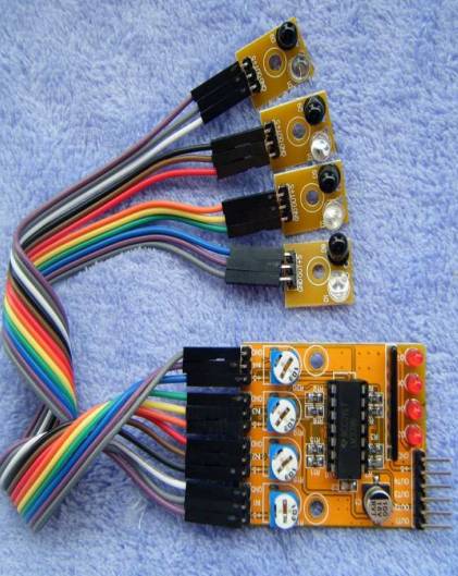 紅外探測傳感器由于發出的是紅外光,常見光對它的干擾極小,且由于價格便宜,而被廣泛應用于智能小車的循線、避障以及其它機器人中物料檢測、灰度檢測等系統中,圖1是利用紅外光電管做傳感器模塊。