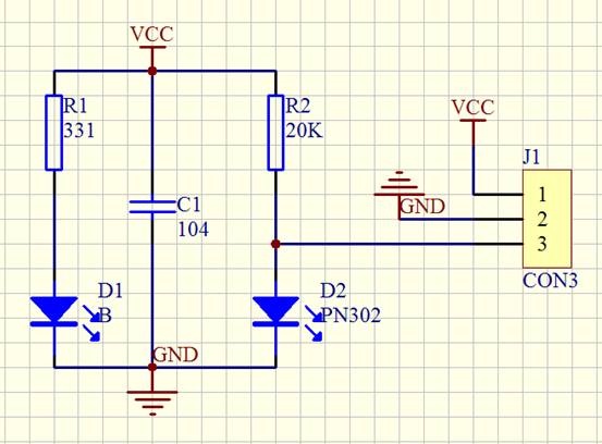 3)、圖中R3為分壓電阻,為比較器提供參考電壓,具體參考電壓的設定應根據R2上端的電壓來決定,此時一般通過調節此電阻來適應不同的檢測路面與高度。