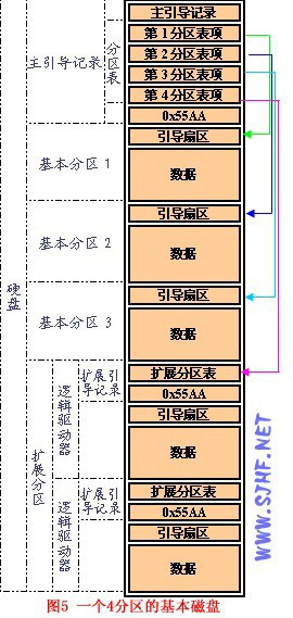 (2)0x1be-0x1fd:DPT分區表,64字節,每16字節描述一個分區,所以硬盤的主分區+擴展分區不能大于4個,另外擴展分區數不能大于1。(現實中,不止4個,其實是擴展分區里面分出來的邏輯分區,對于邏輯分區的問題上面的鏈接也有提到,可以參考。)