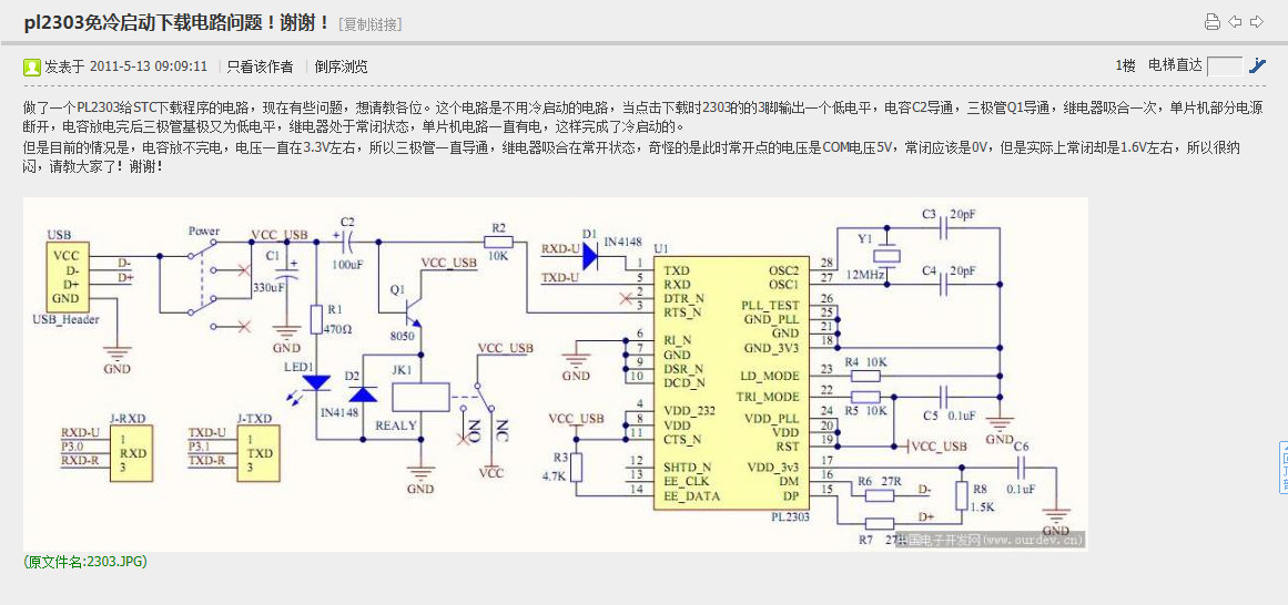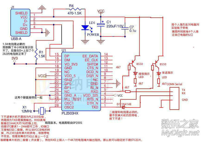 現在很多單片機都是3.3V供電的,那么VDD_325引腳上就要接3.3V電源,而PL2303上的V0_33腳恰好是經過USB_5V轉出的一個3.3V電源,看網上很多人就直接將這個V0_33腳和VDD_325引腳相連,簡單省事,我也這樣做的!可是板子好了問題來了,因為此轉換電路在接上主機后是一直處于上電狀態,那么VDD_325引腳上就會一直有電,那么TXD和RXD上也就會一直有電,那么單片機就會一直有不確定的電……,那么單片機就沒辦法正常復位!!而且還會導致主機有時候死機。