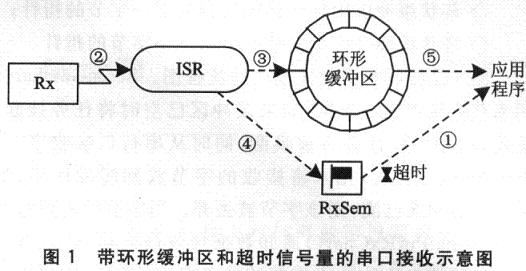 圖1是帶緩沖區和信號量的串口接收示意圖。數據接收信號量初始化為0,表示在環形緩沖區中無數據。