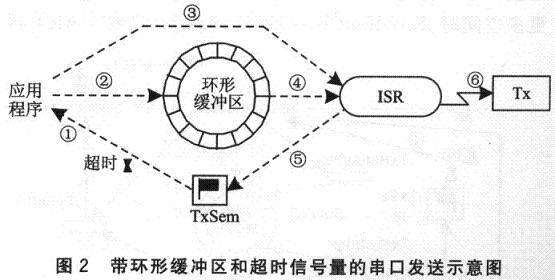 圖2為帶環形緩沖區和超時信號量的串口發送示意圖。發送信號量初始值設為發送緩沖區的大小,表示緩沖區已空,并且關閉發送中斷。發送數據時,用戶任務在信號量上等待(①)。如果發送緩沖區未滿,用戶任務向發送緩沖區中寫入數據(②)。如果寫入的是發送緩沖區中的第一個字節,則允許發送中斷(②)。然后,發送ISR從發送緩沖區中取出最早寫入的字節輸出至UART(④),這個操作又觸發了下一次的發送中斷,如此循環直到發送緩沖區中最后一個字節被取走,重新關閉發送中斷。在ISR向UART輸出的同時,給信號量發信號(⑤),發送任務據此信號量計數值來了解發送緩沖區中是否有空間。