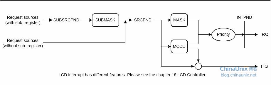 S3C2440的中斷控制器一個(gè)支持60種中斷源,基本的實(shí)現(xiàn)如上圖所示;镜募拇嫫靼SRCPND、INTPND(有且僅有1bit會(huì)被置位,可以通過(guò)這個(gè)寄存器判斷中斷源,找出那個(gè)IRQ源發(fā)生中斷)、INTMOD、INTMSK、PRIORITY(用來(lái)改變中斷的優(yōu)先級(jí)順序,但是其中還是存在一些固有的順序,具體的參看手冊(cè))、INTOFFSET(用來(lái)表示IRQ中INTPND的那個(gè)bit被置位,這樣每一類的中斷源都存在一個(gè)固定的偏移量,這個(gè)寄存器可以用來(lái)用來(lái)計(jì)算偏移量以及通過(guò)這個(gè)偏移量找到對(duì)應(yīng)的中斷處理函數(shù)地址存儲(chǔ)位置等),當(dāng)然也存在一些關(guān)于多個(gè)中斷源構(gòu)成的子中斷寄存器,SUBSRCPND、INTSUBMSK。