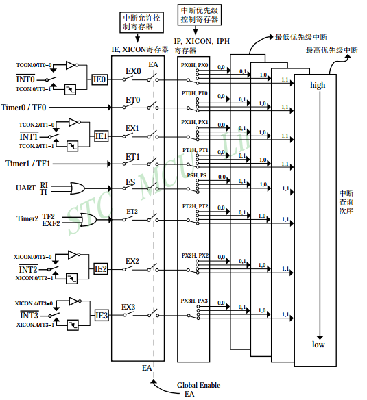 微型機的中斷系統一般允許多個中斷源,當幾個中斷同時向CPU請求中斷,要求為他服務的時候,這就存在了CPU優先響應哪一個中斷源請求的問題。通常根據中斷源的輕重緩急排隊,優先處理最緊急事件的中斷請求源,即規定每個中斷源有一個優先級別。CPU總是先響應優先級別最高的終端請求。