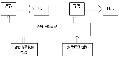 本電路由啟動、清零復位電路、多諧振蕩電路、分頻計數電路、譯碼顯示電路等組成。如下圖所示: