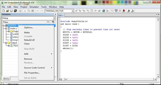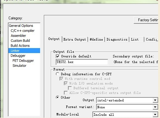 右鍵TEST2,如圖1,點擊 Option 選中左邊欄中的Linker,然后點擊右欄中的output,如圖2 勾中Output file下的 ”Override default” 選項并將輸出文件名后輟改為”.hex”.在Format選項框中選中Other, Output 后 選擇”inter-extended”。其他的值保持默認,點擊確定。 點擊”make”,生成proteus中需要的“.hex”文件,該文件生成在Debug文件夾下的Exe中,如圖3 第三步:proteus中搭建好電路