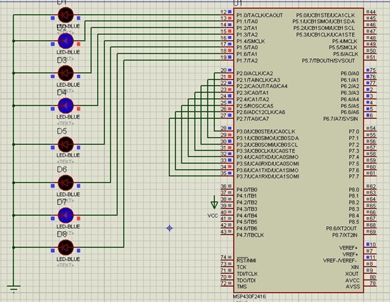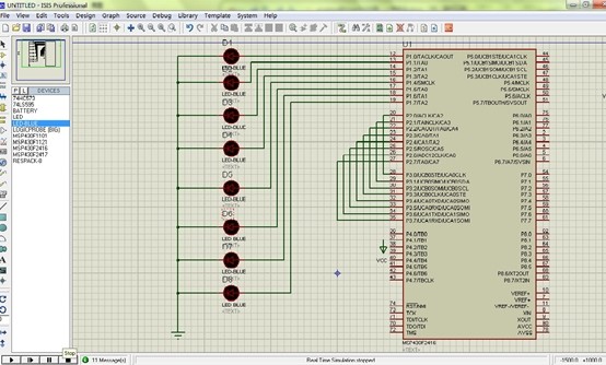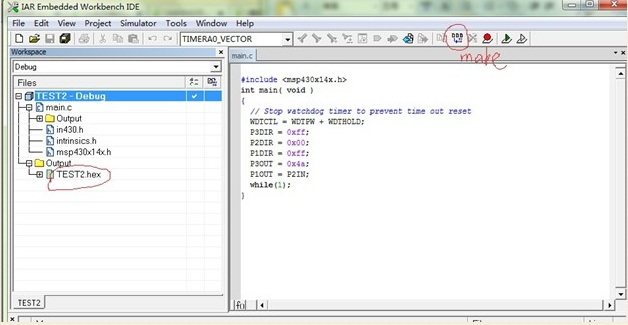 為了便于實現和理解,我的例子比較簡單,程序將P3OUT中的數據傳給P2IN,然后再把P2IN中的數據給P1OUT,最后輸出到LED燈,程序如下: