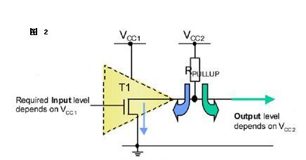 3. 可以利用改變上拉電源的電壓,改變傳輸電平。如圖2, IC的邏輯電平由電源Vcc1決定,而輸出高電平則由Vcc2(上拉電阻的電源電壓)決定。這樣我們就可以用低電平邏輯控制輸出高電平邏輯了(這樣你就可以進行任意電平的轉換)。(例如加上上拉電阻就可以提供TTL/CMOS電平輸出等。)