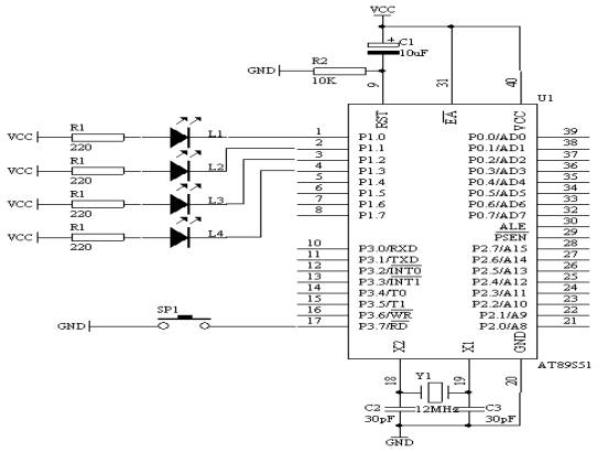 如圖4.9.1所示,開關SP1接在P3.7/RD管腳上,在AT89S51單片機的P1端口接有四個發光二極管,上電的時候,L1接在P1.0管腳上的發光二極管在閃爍,當每一次按下開關SP1的時候,L2接在P1.1管腳上的發光二極管在閃爍,再按下開關SP1的時候,L3接在P1.2管腳上的發光二極管在閃爍,再按下開關SP1的時候,L4接在P1.3管腳上的發光二極管在閃爍,再按下開關SP1的時候,又輪到L1在閃爍了,如此輪流下去。