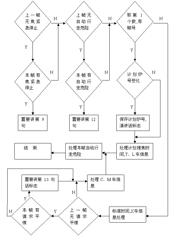 則設置要講第9句話標志,否則轉去看上一幀自動走行危險是否為0,為0則看本幀自動走、行危險是否為1,為1時設置要講第12句話標志,否則取本幀的第一個數,檢查第5位是否為0,為0時為發送給各車上第一幀報文格式,并檢查第二個數的的計劃爐號是否變化,變化則保留計劃爐號,清講第1、2、3、6、7、8句話標志,并按下面的格式保存各個單元的內容。檢查第5位是否為0,不為0時則為中控室PLC發送給各車上的控制第二幀報文格式,并按下面的格式保存各個單元的內容。看上一幀請求平煤是否為0,為0則看本幀是否為1,為1則設置要講第13句話標志,否則就重新接收報文。