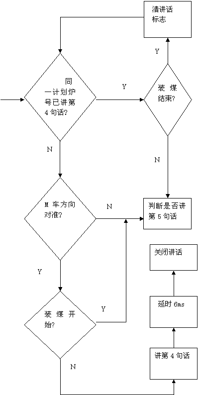 判斷同一個(gè)計(jì)劃爐號(hào)是否講第10句話,已講第10句話,則判斷是否裝煤結(jié)束,是的話就講第10句話,否則講第11句話,沒有講第10句的話就判斷是否為裝煤開始,不是則講11句話,是就設(shè)置已講第10句話標(biāo)志,開始講第10句話,延時(shí)6ms后,關(guān)閉講話。